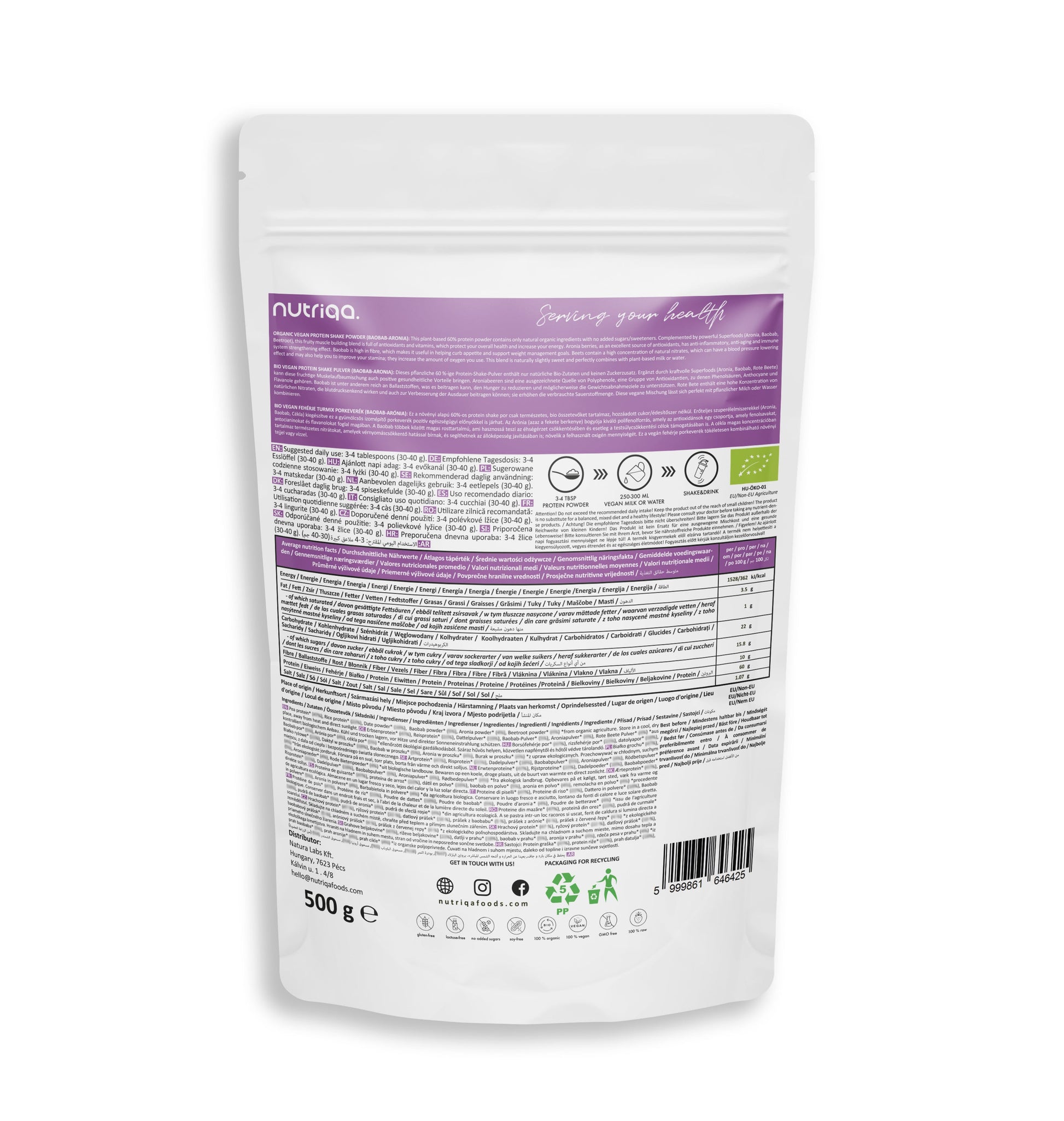 Ingredients: pea protein powder* and rice protein powder* (69%), date powder*, Baobab powder* (5%), Aronia powder* (4%), beetroot powder*, *from certified organic farming. Store in a cool, dry place, away from direct sunlight and heat.