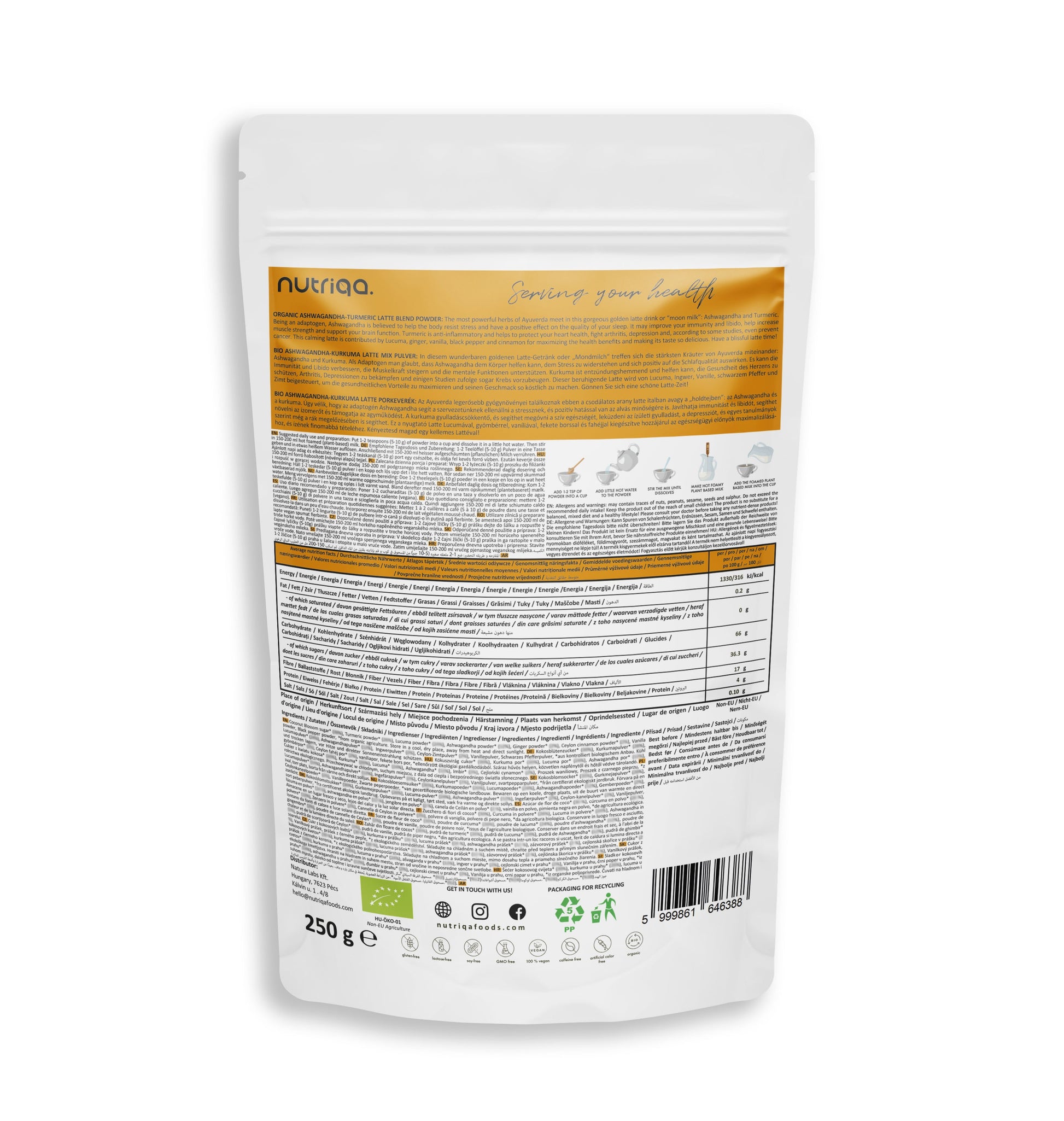 Ingredients: coconut blossom sugar*, Turmeric powder*, Lucuma powder*, Ashwagandha powder* (12%), Ginger powder* (2%), Ceylon cinnamon powder* (2%), Bourbon vanilla powder*, black pepper powder*, *from certified organic farming. Store in a cool, dry place, away from direct sunlight and heat.