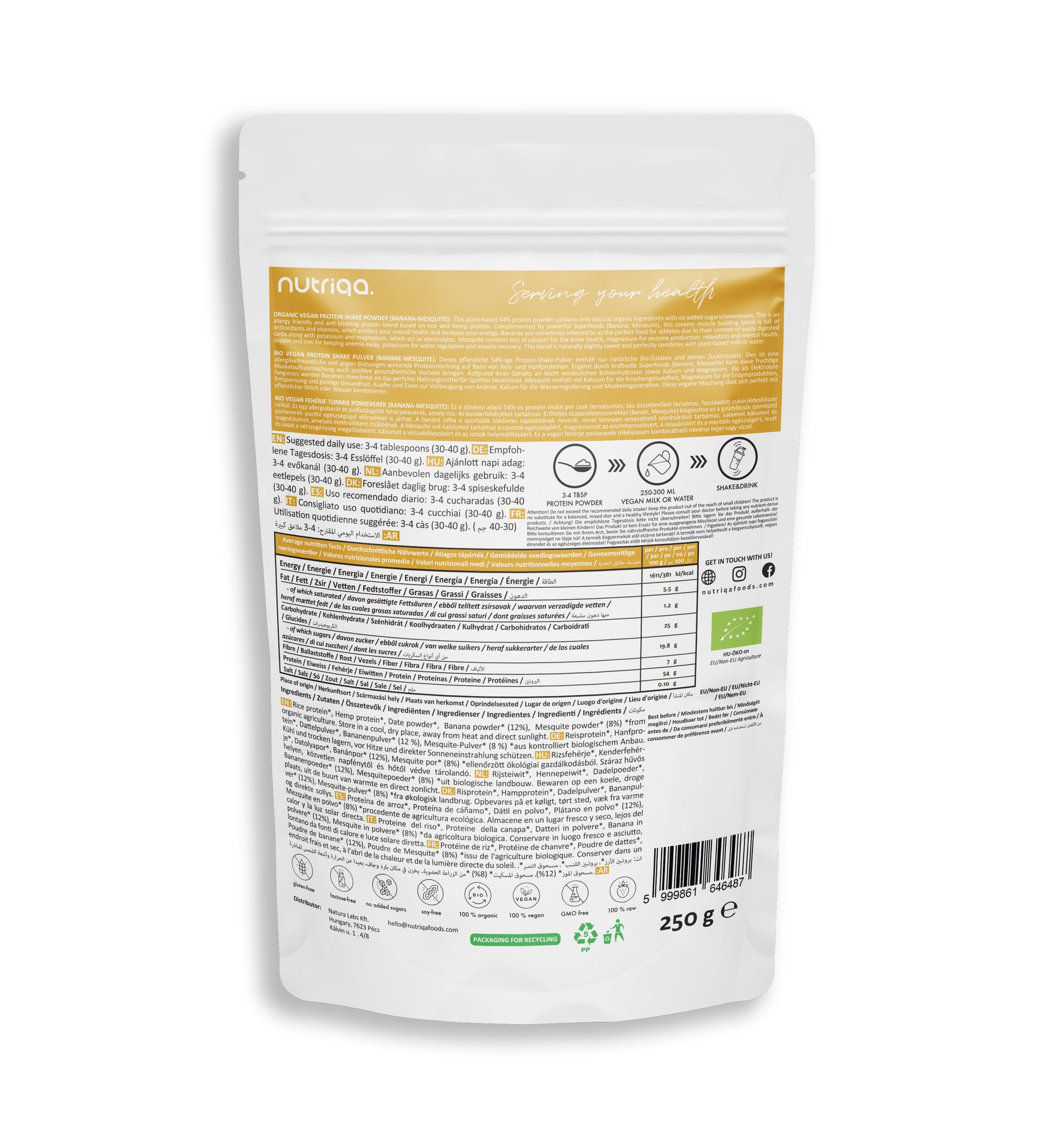 Ingredients: rice protein*, hemp protein*, date powder*, banana powder* (12%), Mesquite powder* (8%) *from certified organic farming.