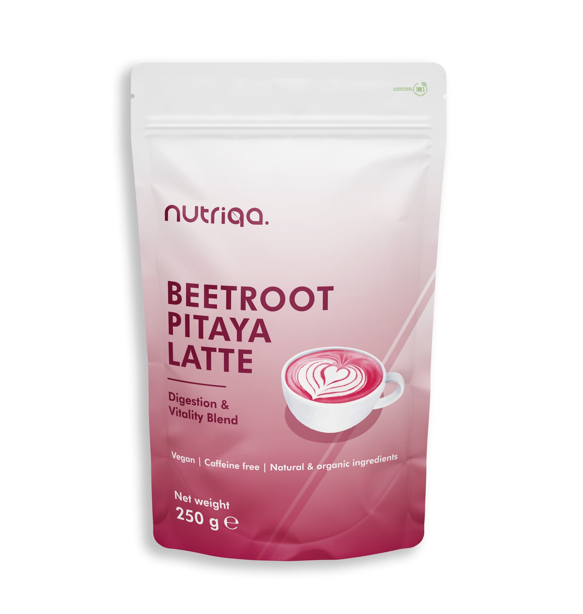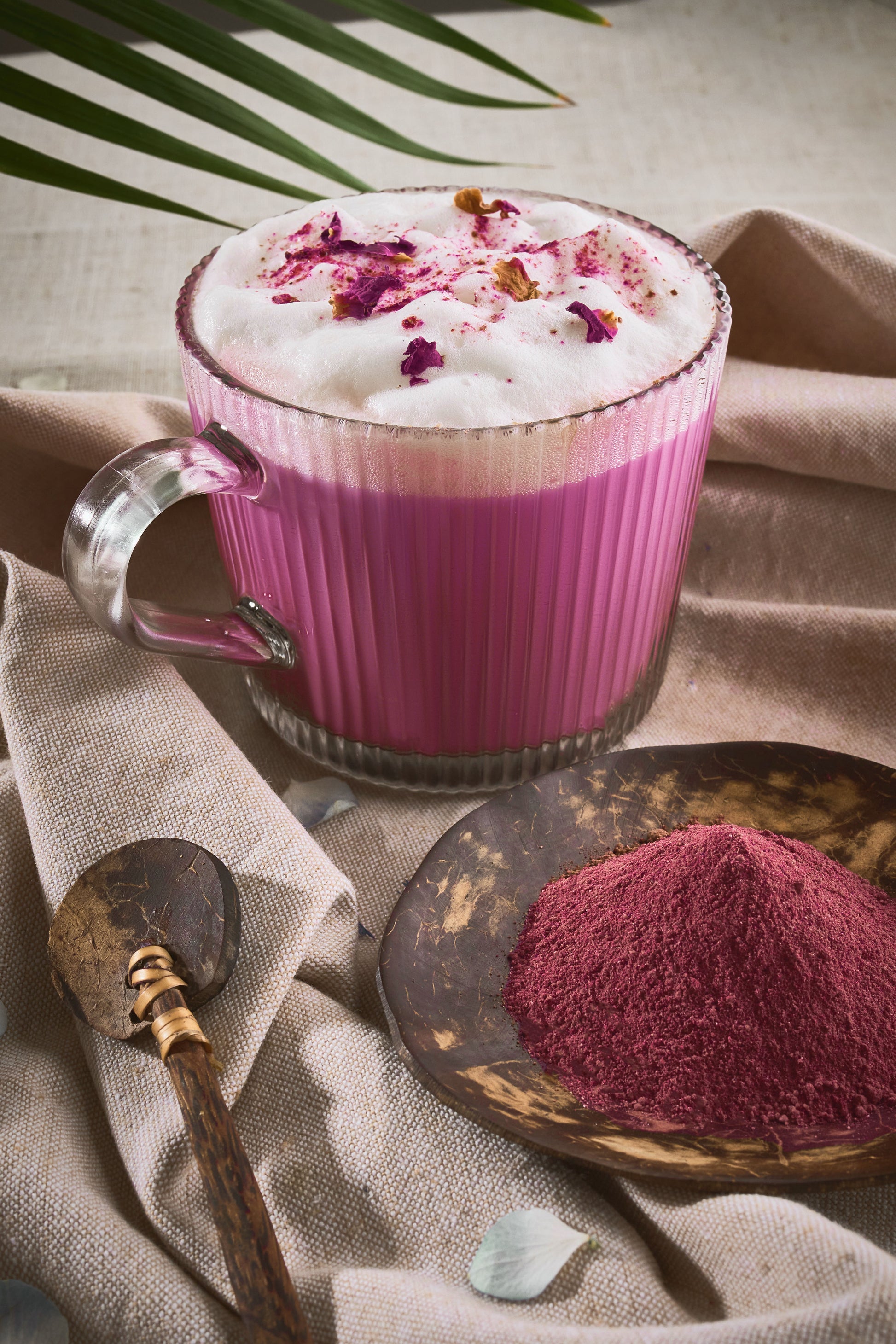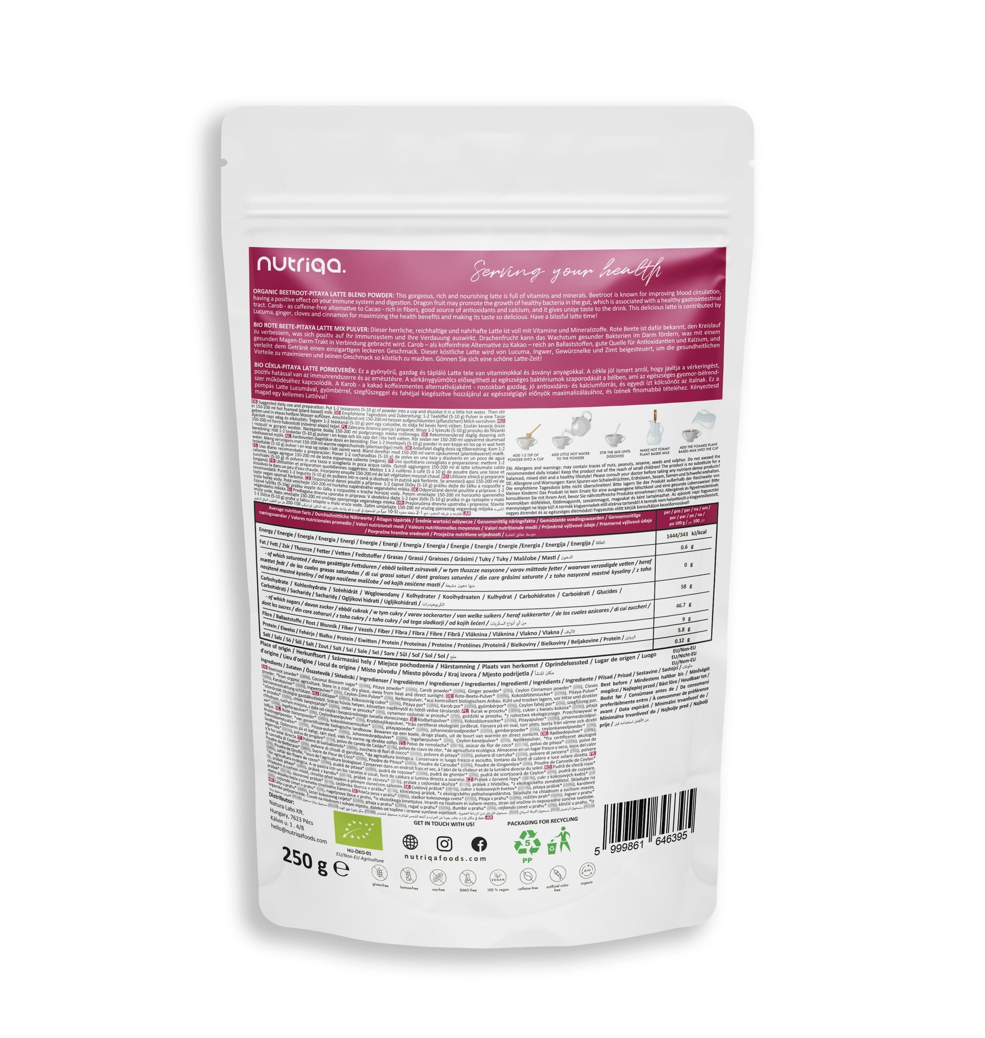 Ingredients: beetroot powder*, coconut blossom sugar*, pitaya powder*, carob powder* (16%), ginger powder* (3%), Ceylon cinnamon powder* (2%), clove powder*, *from certified organic farming. Store in a cool, dry place, away from direct sunlight and heat.