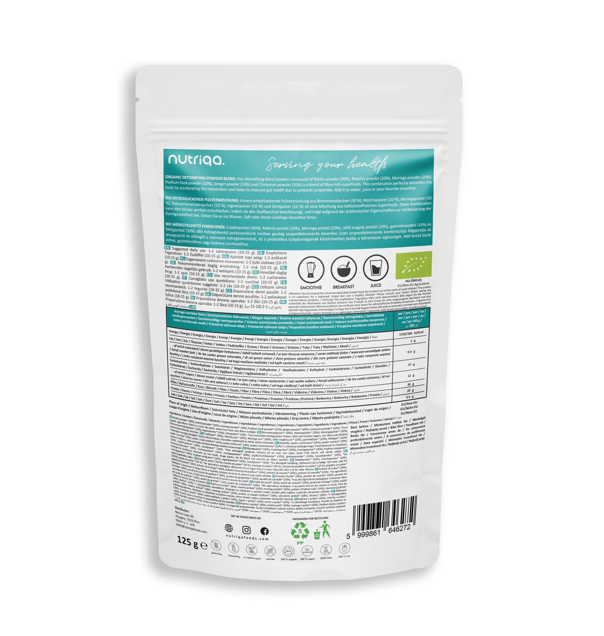 Our detox powder blend of Nettle Powder (30%), Matcha Powder (20%), Moringa Powder (20%), Plantain Seed Husk Powder (10%), Ginger Powder (10%) and Cinnamon Powder (10%) is a blend of fiber-rich superfoods. The combination of these superfoods speeds up metabolism and helps detoxify the body, and its prebiotic properties improve gut health. Add to pure water, juice or your favorite smoothie.