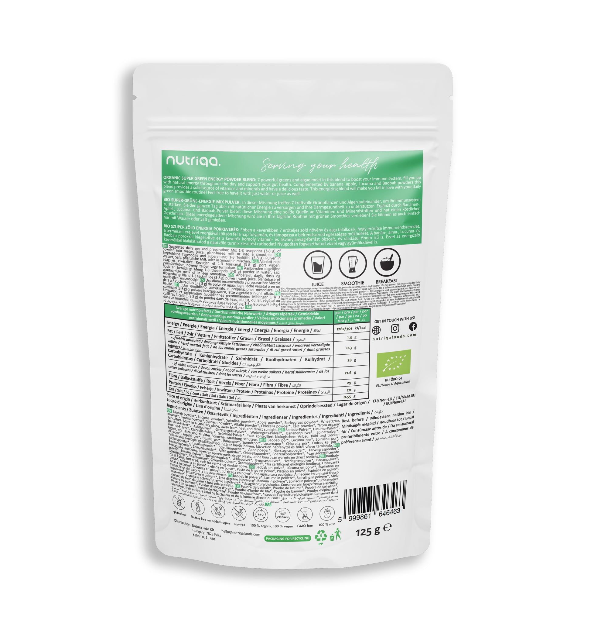 This blend combines 7 powerful green plants and algae to boost your immune system, give you the power of nature to power through the day, and support a healthy gut. With Banana, Date, Lucuma, and Baobab powders, this blend provides a serious source of vitamins and minerals, and tastes great too. With this energizing blend, you can build your daily green smoothie routine! You can also enjoy it with water or juice.