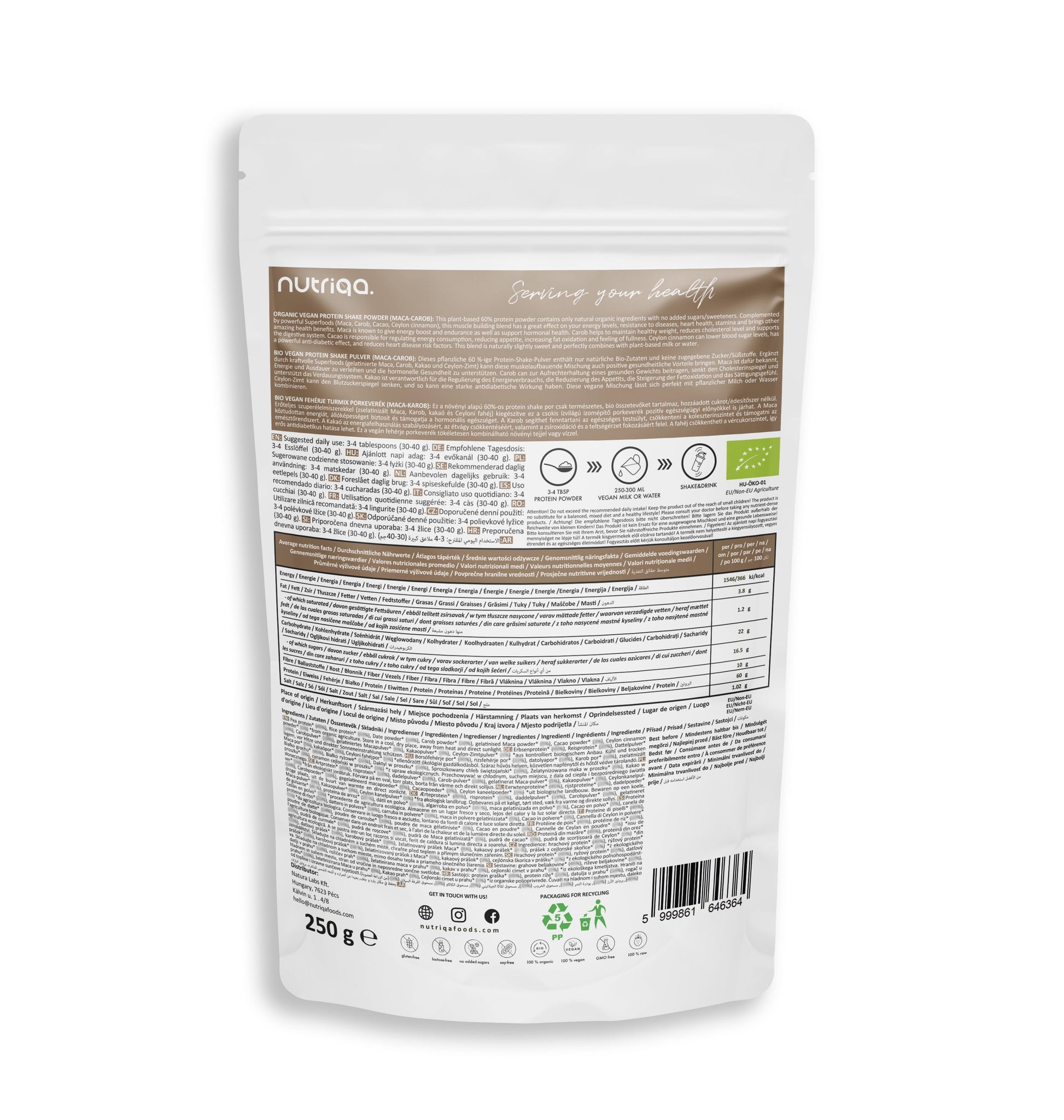 Ingredients: pea protein powder* and rice protein powder* (67%), date powder*, carob powder*, gelatinized maca powder* (5%), cocoa powder*, ceylon cinnamon powder*, *from certified organic farming. Store in a cool, dry place, away from direct sunlight and heat.